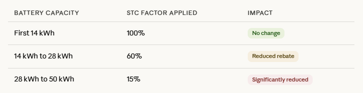If you're looking at a standard 10 to 13 kWh system with average household energy use, the impact is relatively modest. The lower STC rate still applies, but the tiering won't bite you.